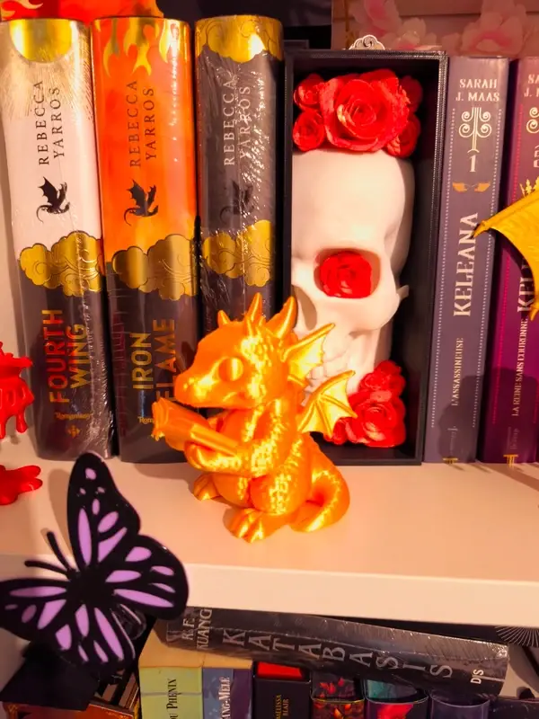 Quoi de mieux qu'une dragonne dorée pour garder vos romans préférés ? Cette version spéciale d'Andarna ne se contente pas de décorer votre étagère : elle partage votre passion pour la lecture ! Tenant un petit livre entre ses griffes, elle est le symbole ultime pour tout membre du Basgiath War College.
