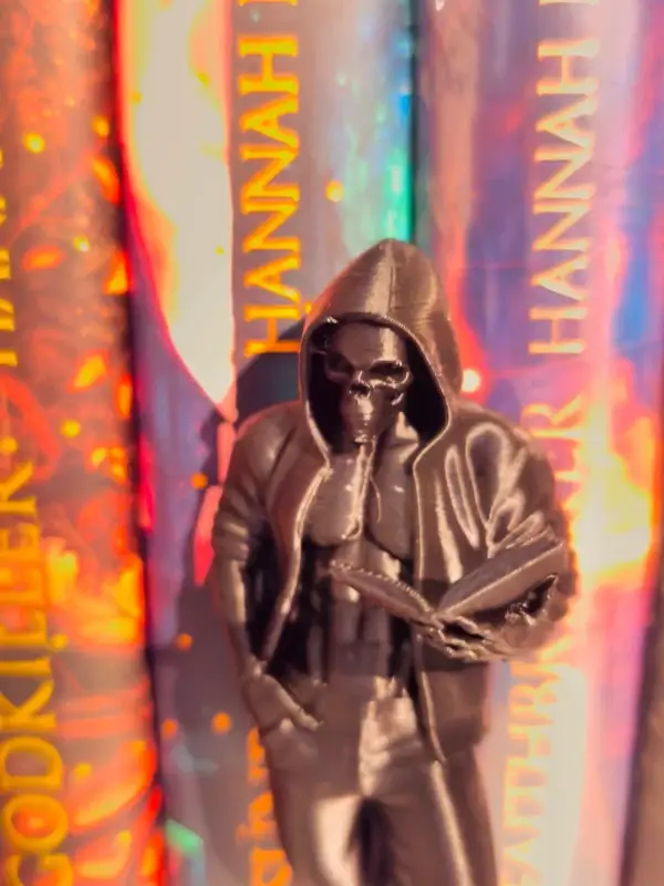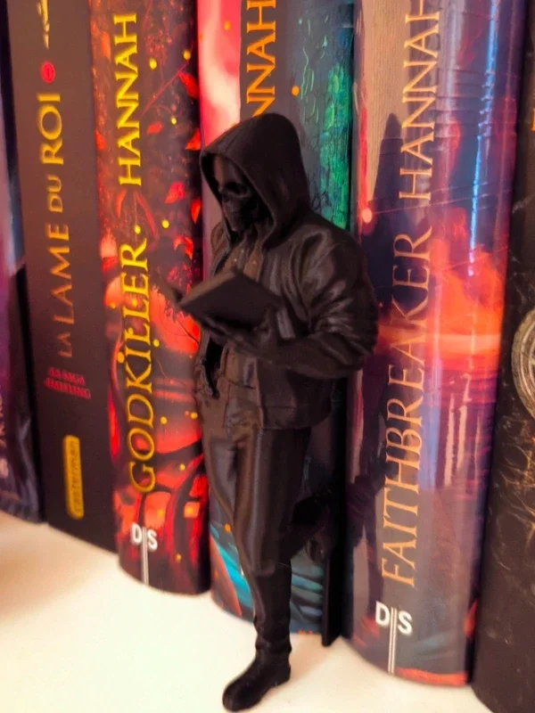 Donnez une atmosphère mystérieuse et sombre à votre bibliothèque avec cet Insert Livre exclusif en forme de faucheuse. Ce squelette en tenue moderne (sweat à capuche et jean) est représenté en train de lire, créant un contraste fascinant entre le macabre et la passion des livres.